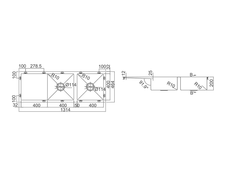 Stainless Steel Double Bowl Sink with Drainer Material: 1.2mm 304 Grade Stainless Steel Capacity & Weight: 2x32L Dimensions: 1314x464x200mm